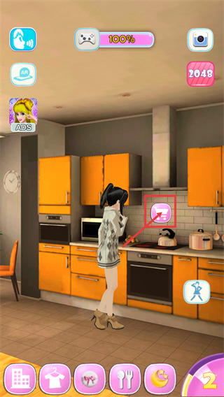 3、切换至厨房场景后进度保持100%,点击被标注的【购物车图标】,能够进入道具或物品的购物相关功能模块。