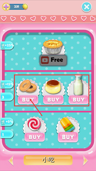 4、进入小吃界面后,可通过【Free】标识对应的内容获取物品,或点击【BUY】按钮购买小吃,不同小吃对应不同增益(如+25%)。