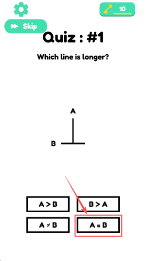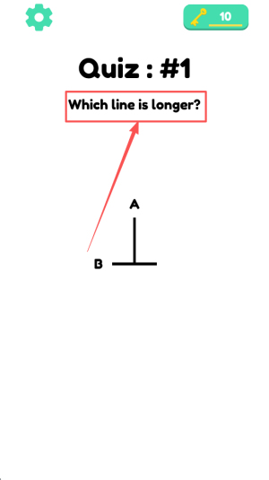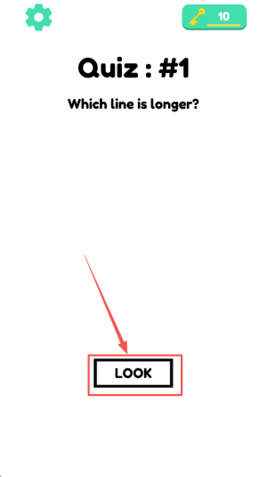 1、查看题目:屏幕显示“Quiz:#1 Which line is longer?LOOK”,点击“LOOK”,进入观察。