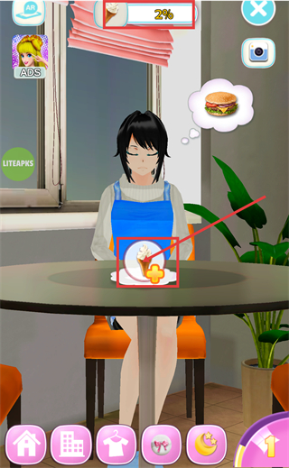 1、留意场景中带指引标识的【汉堡】图标,跟随指引交互可推进游戏流程,同时关注界面功能按钮的使用。