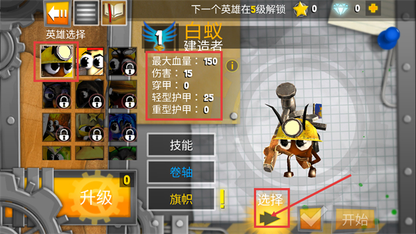 1、选择【白蚁-建造者】英雄,其【最大血量-150】【伤害-15】等属性适配初期战斗,点击【选择】后即可进入关卡。