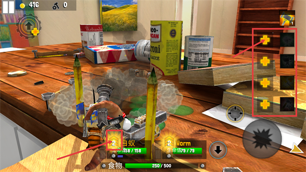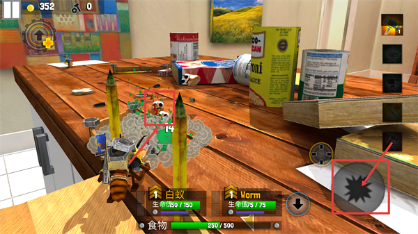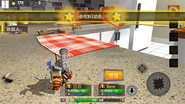 2、关卡目标为【杀死5只幼虫】,操控【白蚁】与幼虫战斗,同时关注下方【食物-250/500】资源,维持单位存续。
