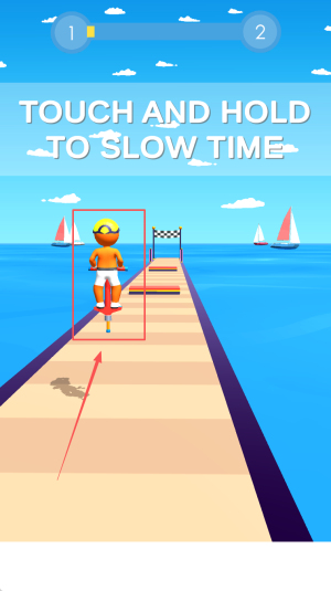 3、开始游戏:在关卡界面按住屏幕,使用“TOUCH AND HOLD TO SLOW TIME”减速跳跃。