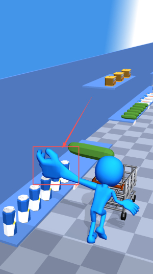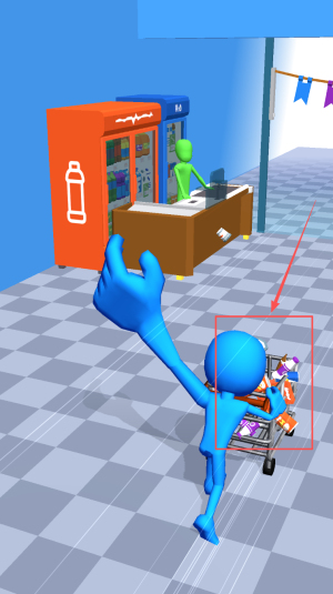1、进入游戏后操控角色移动,在货架间穿梭并点击选中商品,将其拖入自己的购物车。