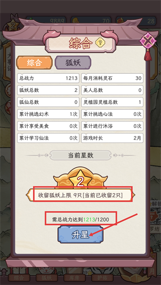 2、进入【综合】界面查看总数据,当【总战力】达要求时,点击【升星】可提升【收留狐妖上限】,当前可从9只升至更高。