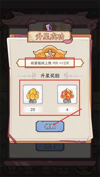 3、【升星成功】后,【收留狐妖上限】会提升,同时可领取【仙晶-20】与【神玉-4】的升星奖励,记得点击【领取】。