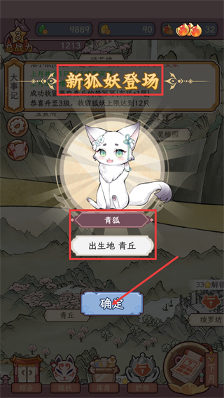 4、升星后会解锁【新狐妖登场】,如出生地为【青丘】的【青狐】,点击【确定】即可完成新狐妖的收留流程。