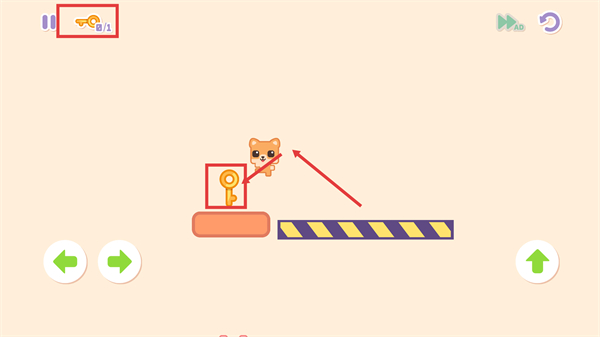 2、在关卡内找到红色按钮,操控角色触发该按钮,可激活场景机关(如升降平台),助力获取上方的【钥匙】。
