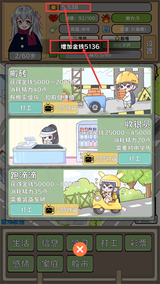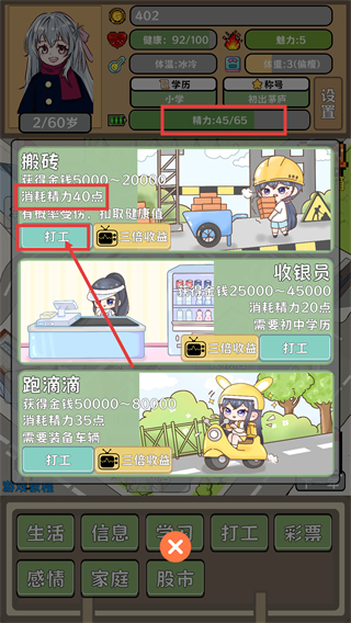 1、在打工界面选择【搬砖】,消耗40点精力可获得5000~20000金钱,但需注意其有概率扣减健康值,需合理安排精力。