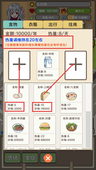 3、进入生活界面的食物板块,需维持热量在20左右,可选择【鸡蛋-热量5】【三明治-热量10】等食物组合来调控。