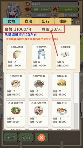 4、搭配食物后,需查看当前热量(如23/天)是否接近建议值,可根据金额与热量需求调整食物选择以适配角色状态。