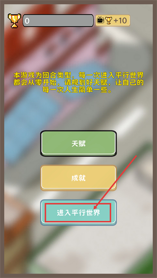 1、游戏为回合制,每次需点击【进入平行世界】从零开启人生,可先规划【天赋】来简化发展流程。