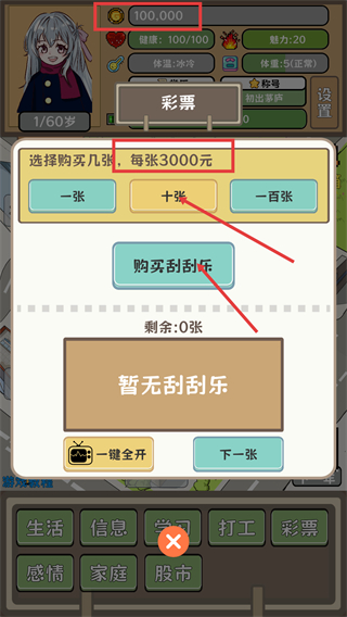 2、进入彩票界面,每张彩票3000元,可选择购买数量(如十张),点击【购买刮刮乐】获取彩票参与抽奖。
