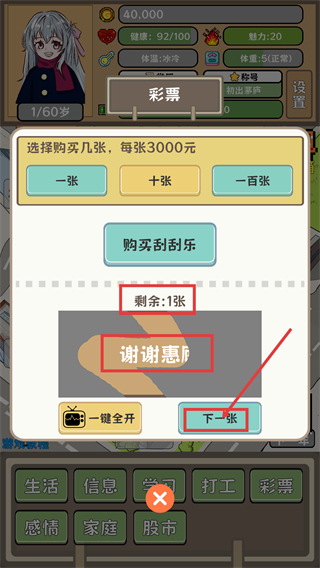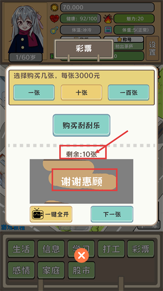 3、购买后剩余彩票会显示(如10张),刮开后可能出现【谢谢惠顾】,需继续刮奖以尝试获取奖励。