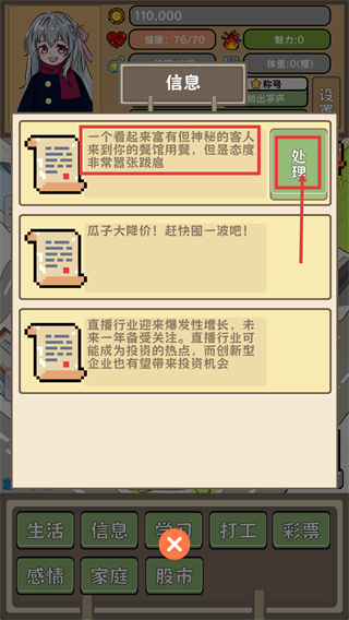 1、在信息界面看到神秘客人事件后,点击【处理】按钮可触发对应的互动选项,推进事件流程。