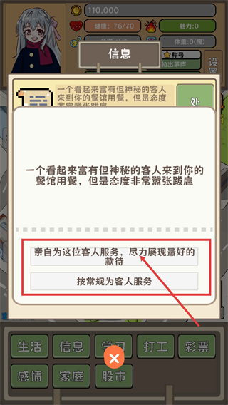 2、处理神秘客人事件时,选择【亲自为这位客人服务】的选项,可提升事件的正向反馈概率。