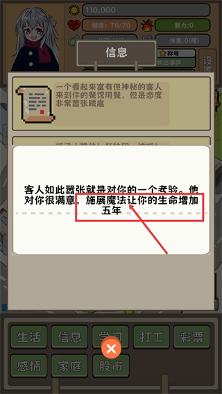 3、完成神秘客人的服务后,若获得满意评价,会触发奖励,如【生命增加五年】,助力角色发展。