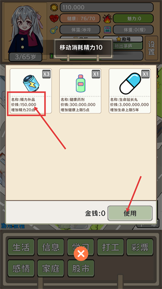 4、在道具界面选择【精力补品】,消耗对应金钱后点击【使用】,可增加20点精力,支撑后续玩法操作。