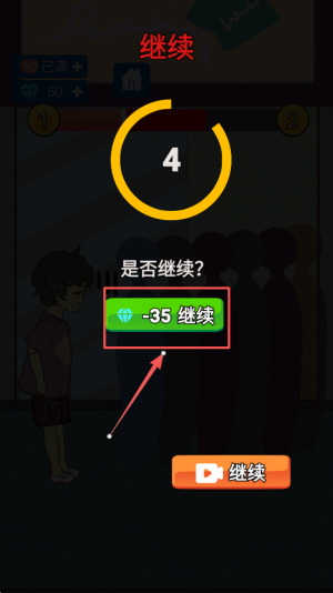 4、继续挑战:当弹出“是否继续?”,点击“继续”扣除35分进入下一关。