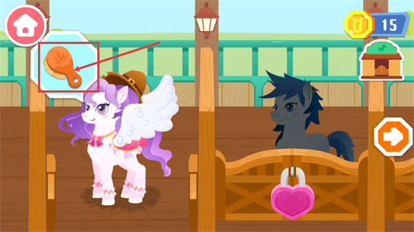 1、在小马互动场景中,点击提示的【毛刷道具】,即可进入小马的清洁互动环节。