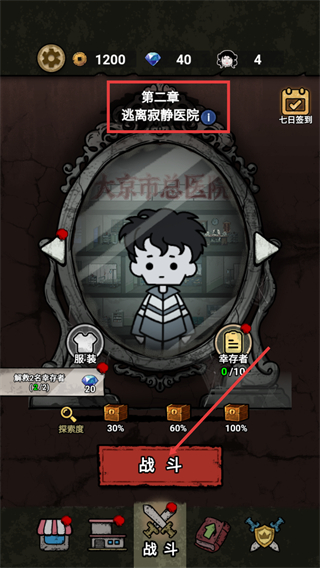 1、进入【第二章-逃离寂静医院】界面,点击【战斗】按钮开启关卡,同时推进【幸存者-0/10】进度以解锁探索奖励。