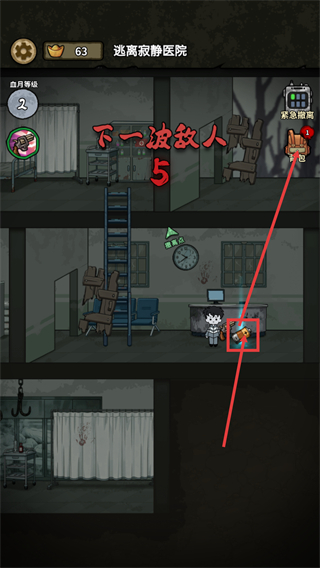 2、在医院场景中,先收集【道具】资源,同时留意【下一波敌人-5】的提示,提前向【撤离点】方向移动。