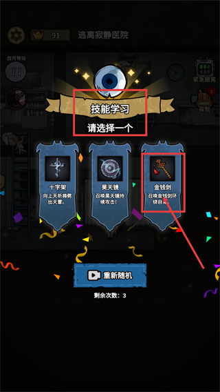 3、触发【技能学习】界面时,可选择【金钱剑】类技能,其召唤剑环的效果能提升应对敌人的输出能力。