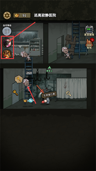4、战斗中使用已学技能攻击敌人,收集【钥匙】道具,同时利用【药品】维持生命值,向【撤离点】推进。