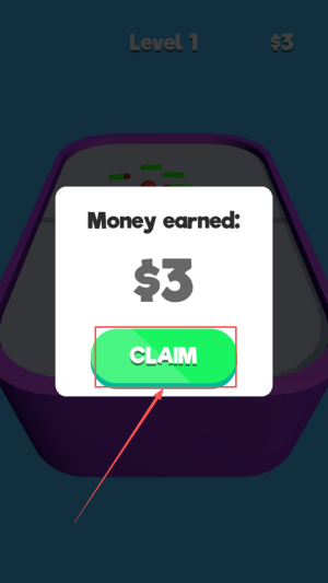 4、领取奖励:当界面显示“Money earned: $3”,点击“CLAIM”收取金币进入下一关。