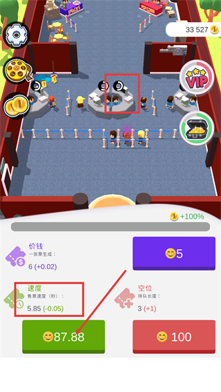 2、消耗【87.88】笑脸提升【售票速度-(5.85-0.05)】,同时扩展排队空位,提升票务处理效率。