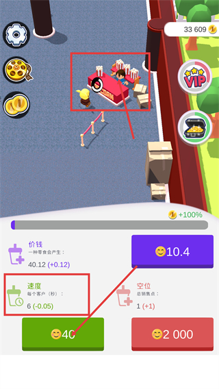 3、在【POPCORN】区域,消耗【40】笑脸优化零食生产速度,增加销售点以提升营收效率。