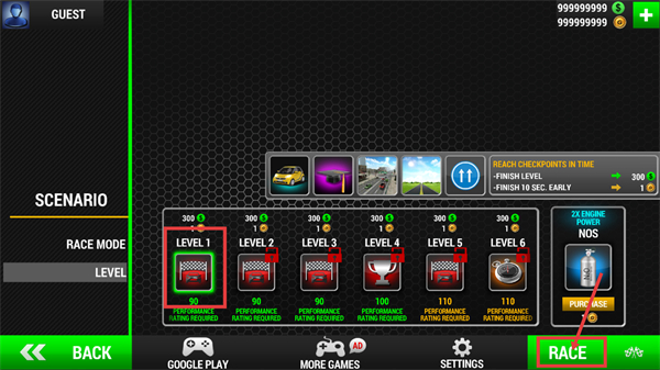 1、选定【LEVEL1】后点击【RACE】开启关卡,需满足【90-PERFORMANCE-RATING-REQUIRED】的要求。