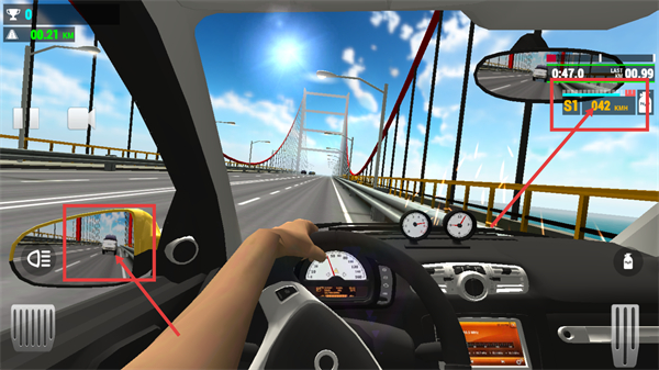 3、行驶至桥梁路段时,关注速度表维持【S1-042-KMH】左右车速,同时通过后视镜留意后方车辆,避免追尾。