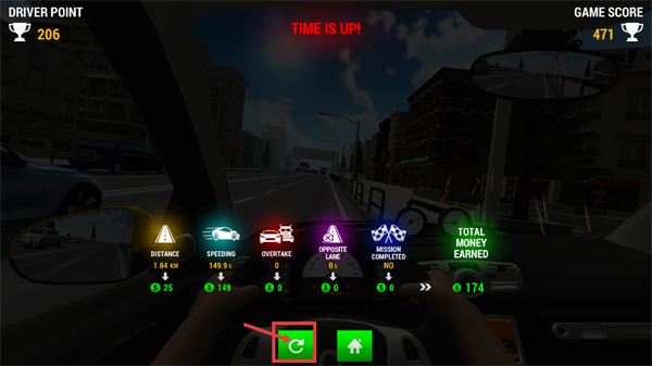 4、时间结束后查看【DRIVER-POINT】与【GAME-SCORE】,点击重开按钮重新挑战,优化驾驶策略以提升成绩、获取更多奖励。