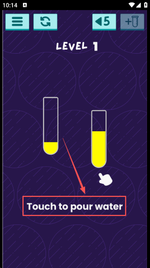 3、开始游戏:在关卡界面查看水量目标,点击“Touch to pour water”倾倒液体。