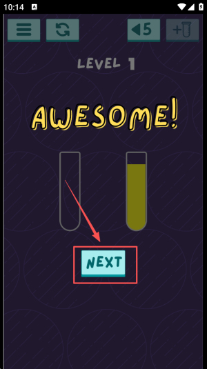 4、完成通关:当界面显示“AwEsome!”,点击“NEXT”进入下一关倒水任务。