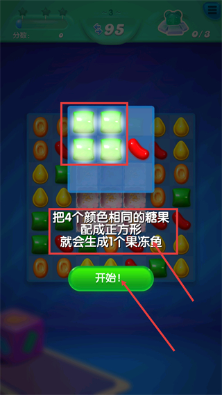 2、将4个同色糖果配成正方形,生成【果冻鱼】,这是本关的核心消除策略,助力完成目标。