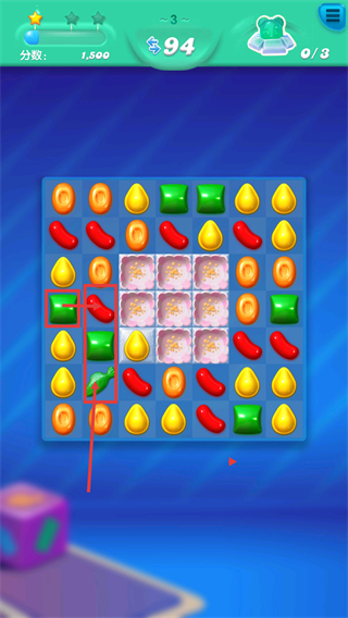 3、交换【绿色糖果】与相邻的【红色糖果】,触发消除效果并积累分数,同时推进找小熊的进度。