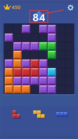 4、完成消除后,分数提升至【84】,持续匹配方块组合,向关卡目标分数推进。