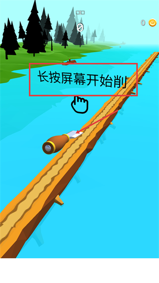 1、按照提示【长按屏幕开始削】,操作刀具沿木板路径切削,这是推进关卡的核心交互方式,需持续长按控制切削节奏。
