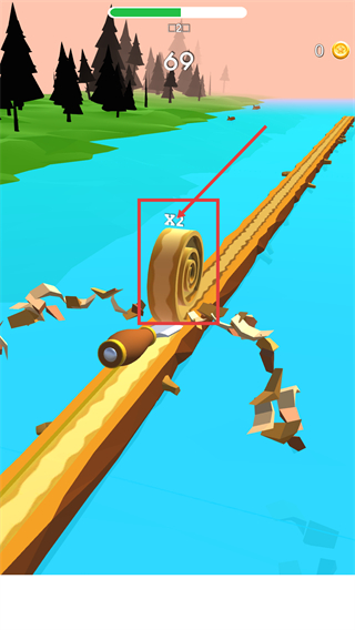 2、切削过程中拾取【x2】道具,可获得双倍收益,同时关注上方数值(如【69】)的增长,这是关卡进度的直观体现。