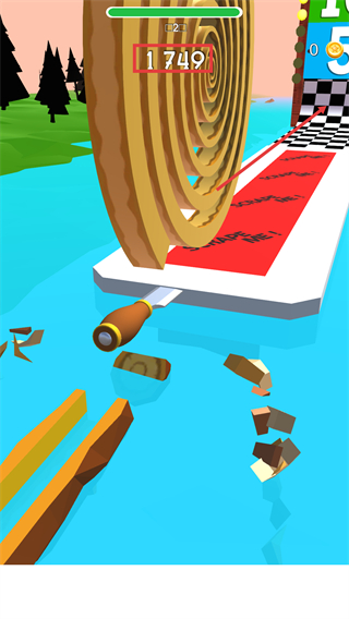 3、持续切削木板至目标形状,数值会累积到【1749】,此时木板会移动至终点区域,需保持切削动作直至完成当前阶段。