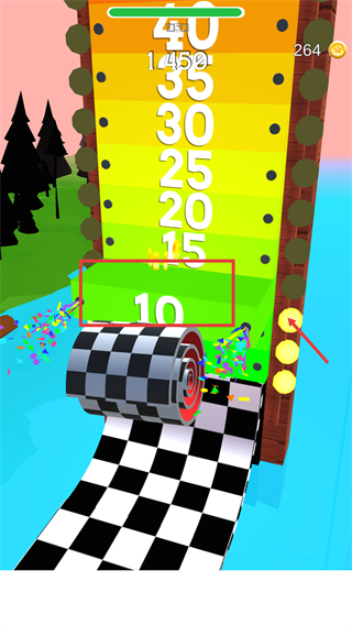 4、木板抵达终点后,会根据进度获得对应奖励,当前触发【10】档位奖励,金币计数提升至【264】,完成当前关卡。