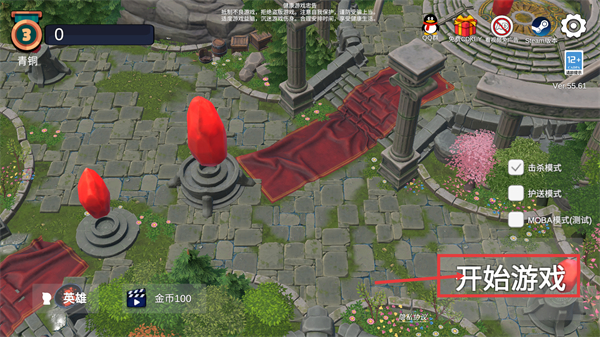 1、选择【击杀模式】后点击【开始游戏】,进入对局前可查看界面中的【英雄】和【金币100】资源,为对局做准备。