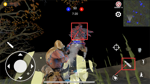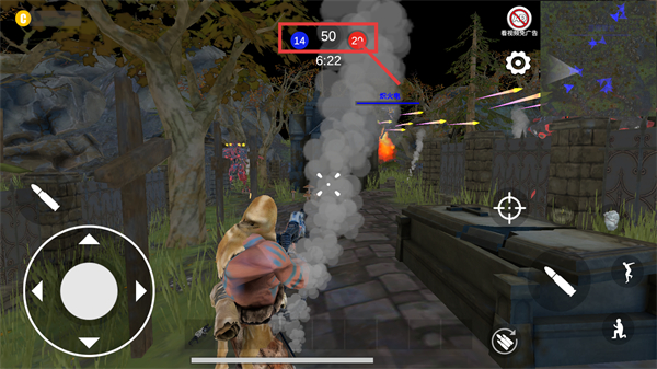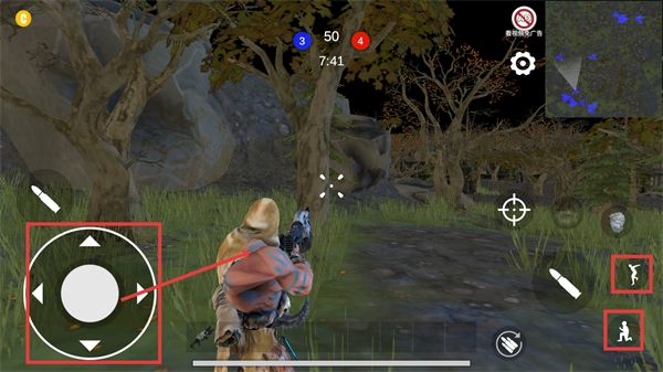 2、对局中通过左侧【方向轮盘】控制移动,右侧功能键(如蹲伏)调整状态,配合射击键与敌人交互,推进对局进度。