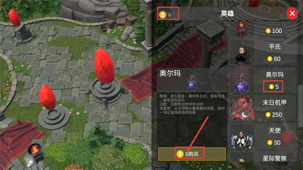 1、消耗【5金币】购买【奥尔玛】英雄,其拥有隐身和流星攻击技能,能在对局中利用隐身规避伤害、流星进行范围输出。
