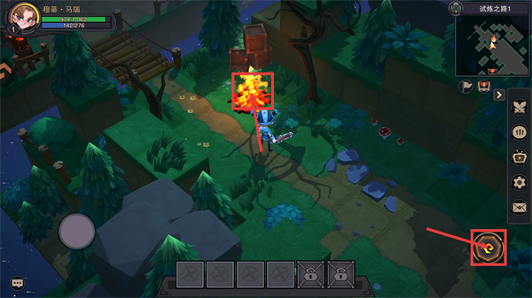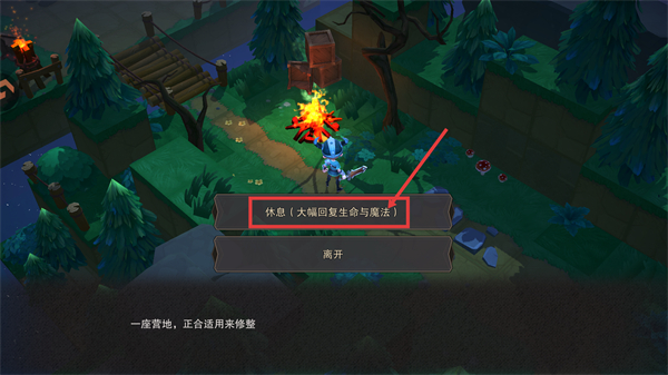 1、在【试炼之路1】场景中,靠近火堆后点击界面的对应按钮,可触发营地交互功能,为后续休整做准备。