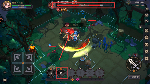 3、对战【野猪王·多斯】时,使用技能栏中的对应技能释放【旋风】攻击,造成伤害后点击【行动结束】推进回合。