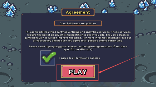 2、同意协议:阅读游戏协议,勾选“我同意所有条款和政策”,然后点击“PLAY”按钮,开始游戏。