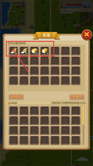 3、交易界面中会展示【可供出售的物品】,包含粮草、面包等资源,可根据部队需求,利用金币进行购入或售出操作。